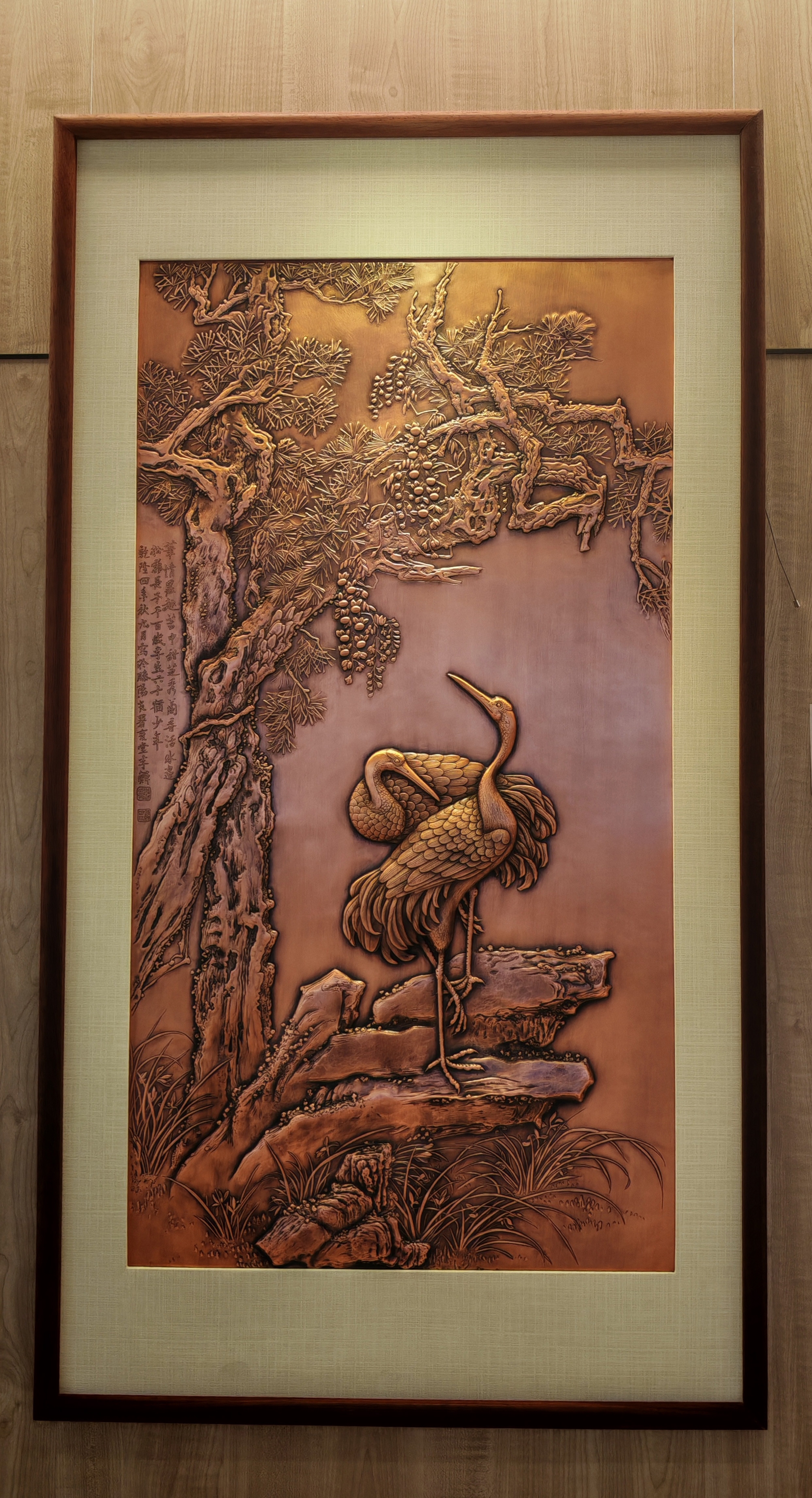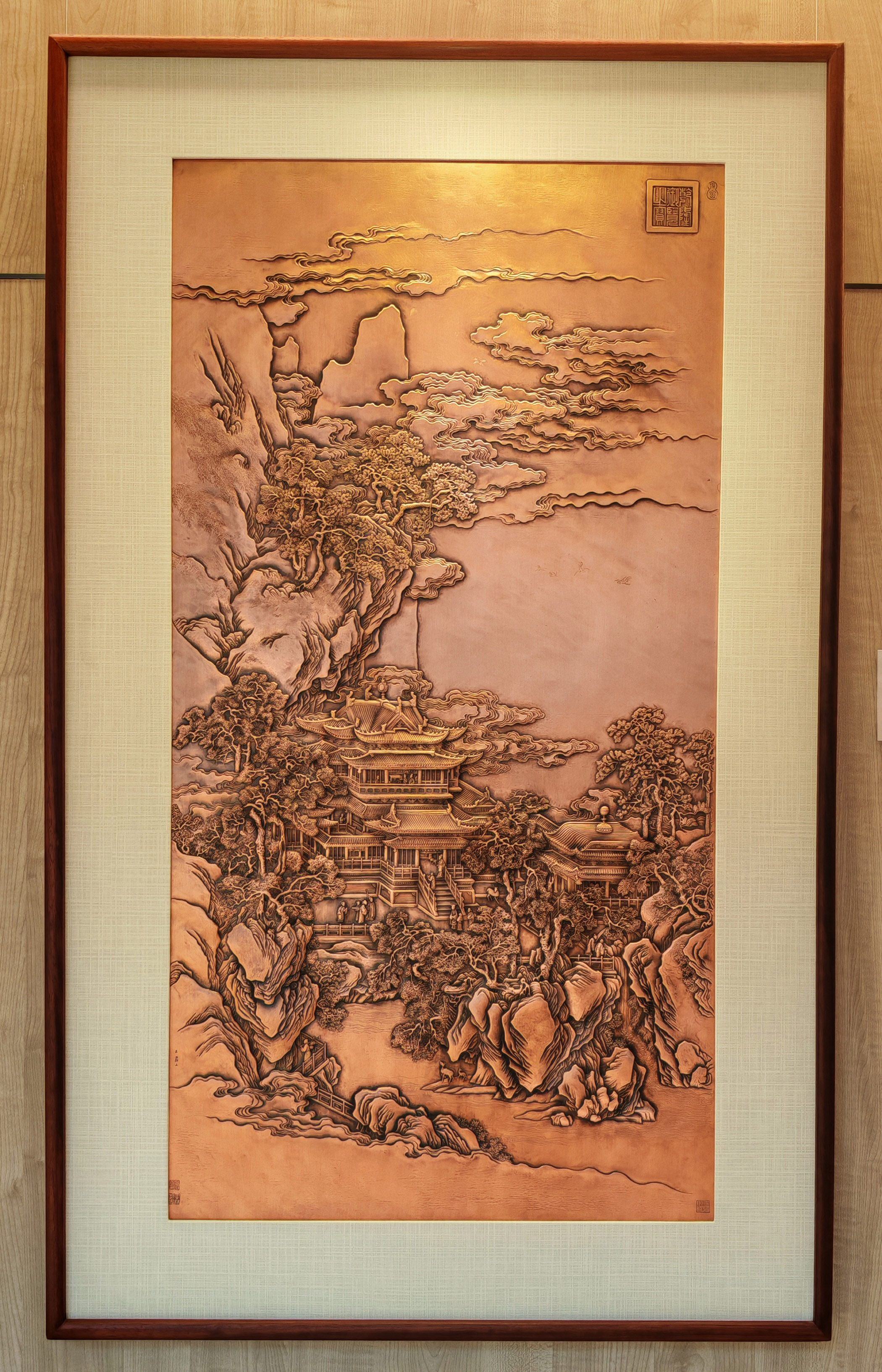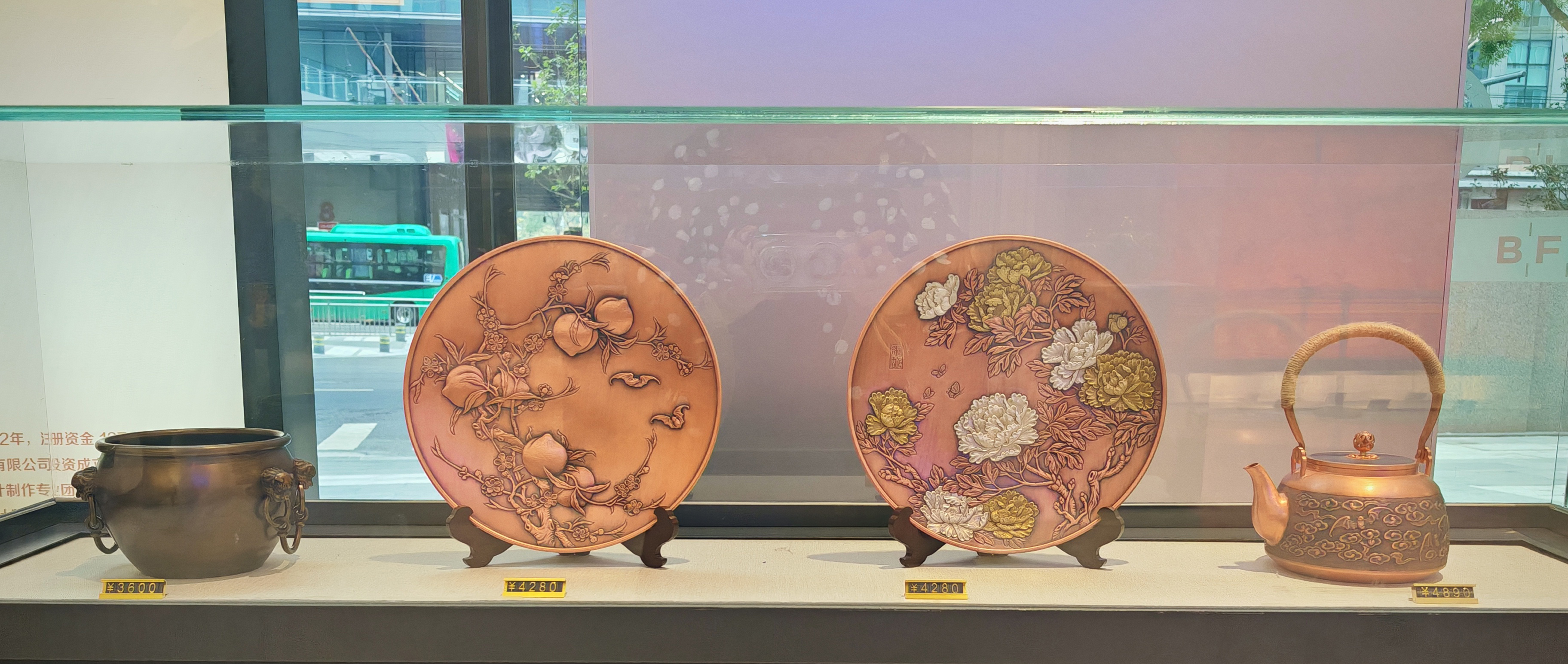 此次金屬公司展示的作品,不僅有傳統非遺金屬鍛鏨工藝的銅壁畫、銅屏風、銅火鍋、銅賞盤、銅壺等精品,還有金屬公司近年來順應市場開發的車掛、琉璃飾品、筆筒、小擺件、香道產品等廣受大眾喜愛的文創產品。