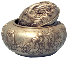 此熏爐以平雕、浮雕和圓雕技法,用997克純銀手工制成。爐身飾有十六羅漢,十六羅漢是釋迦牟尼佛弟子,受佛所托,常駐世間,不入涅盤,以救度眾生。爐蓋飾有騰龍祥云紋,寓意吉祥如意、富貴滿堂。
