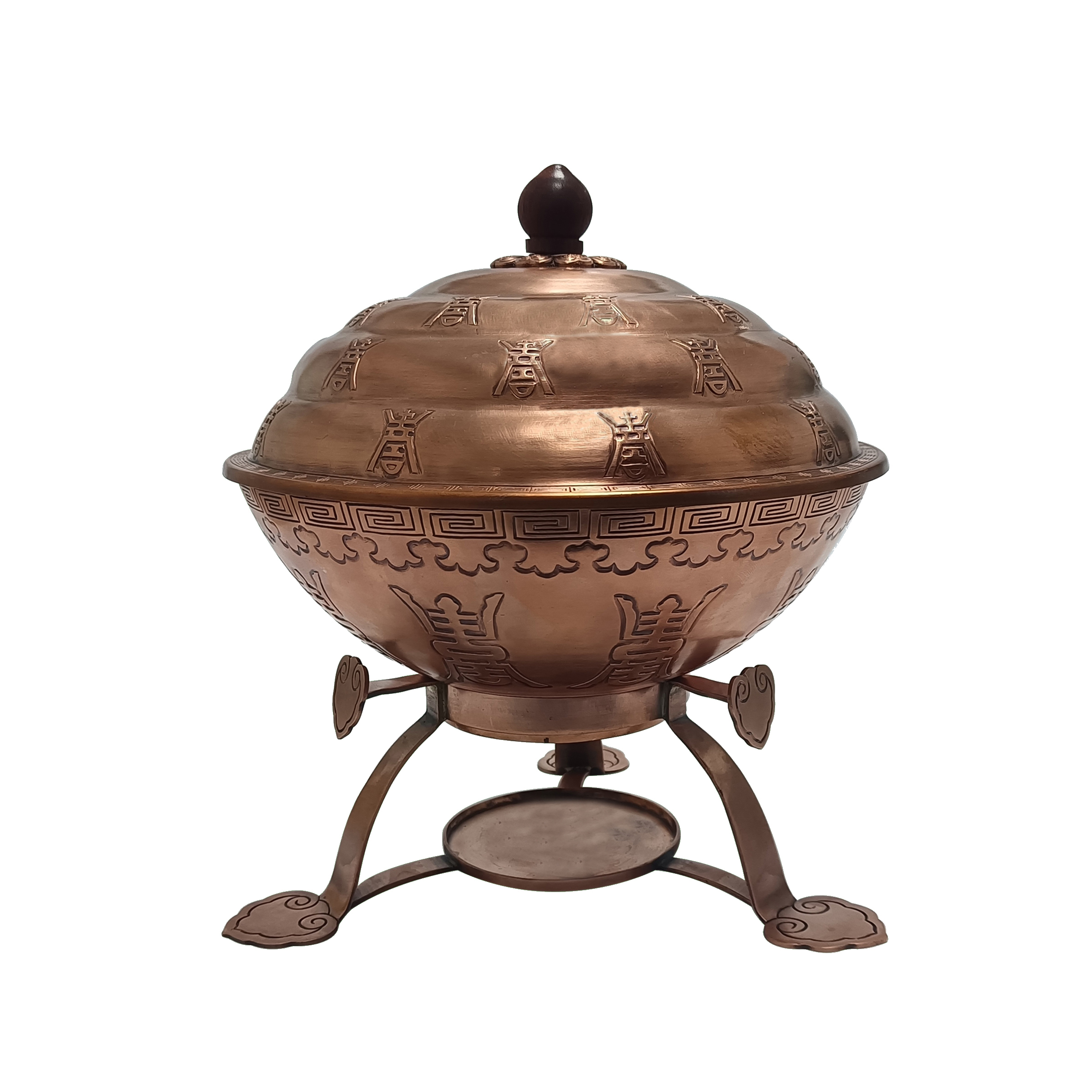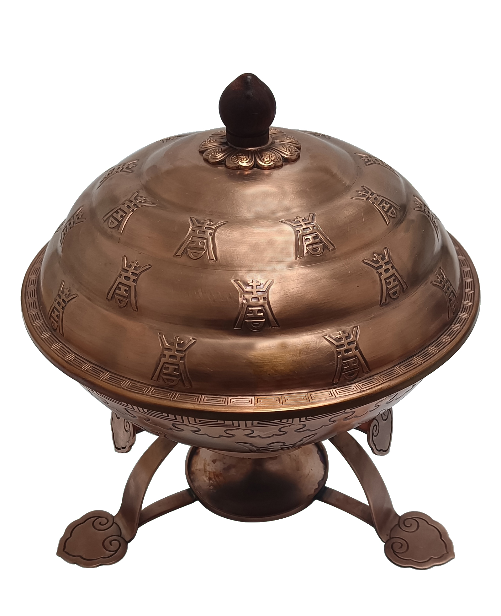 我公司設(shè)計制作的壽字暖鍋由鍋蓋、鍋身、三足如意托三部分構(gòu)成。壽字暖鍋形制源于宮廷,器形華麗,鍋身為紫銅打造?,F(xiàn)代研究表明,人體攝入適量銅元素,能促進骨骼、內(nèi)臟及神經(jīng)系統(tǒng)發(fā)育;促進細胞生成,預(yù)防貧血。暖鍋通體以非遺技藝金屬鍛鏨制作而成,鏨有壽字紋、回字紋、如意紋,寓意富貴長春、福壽延綿。