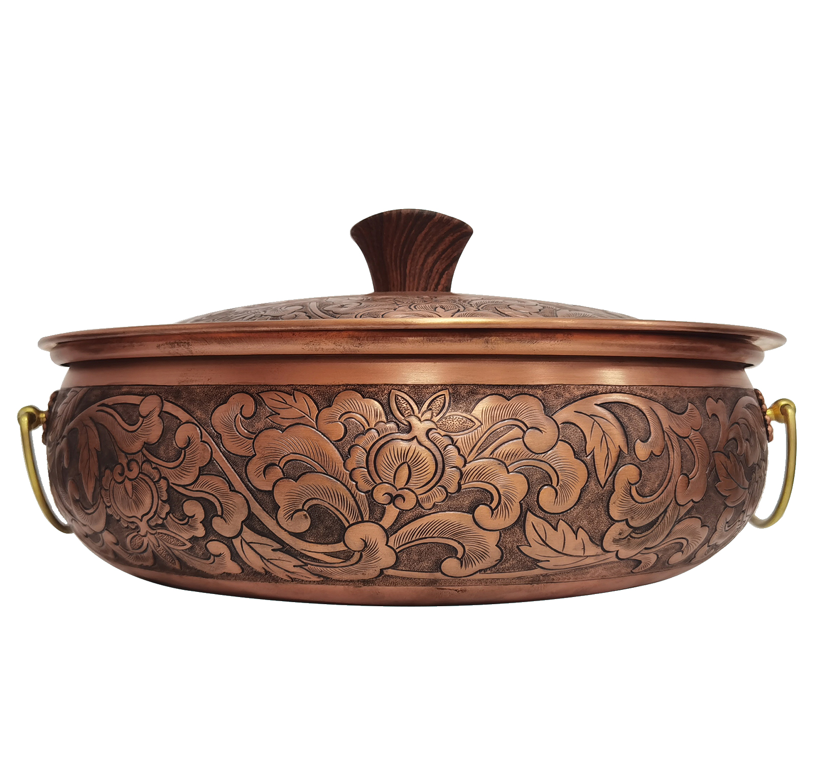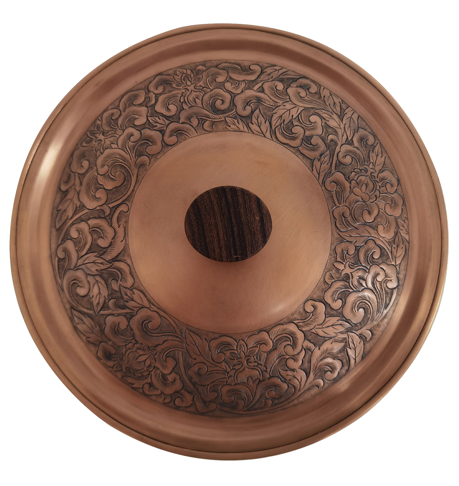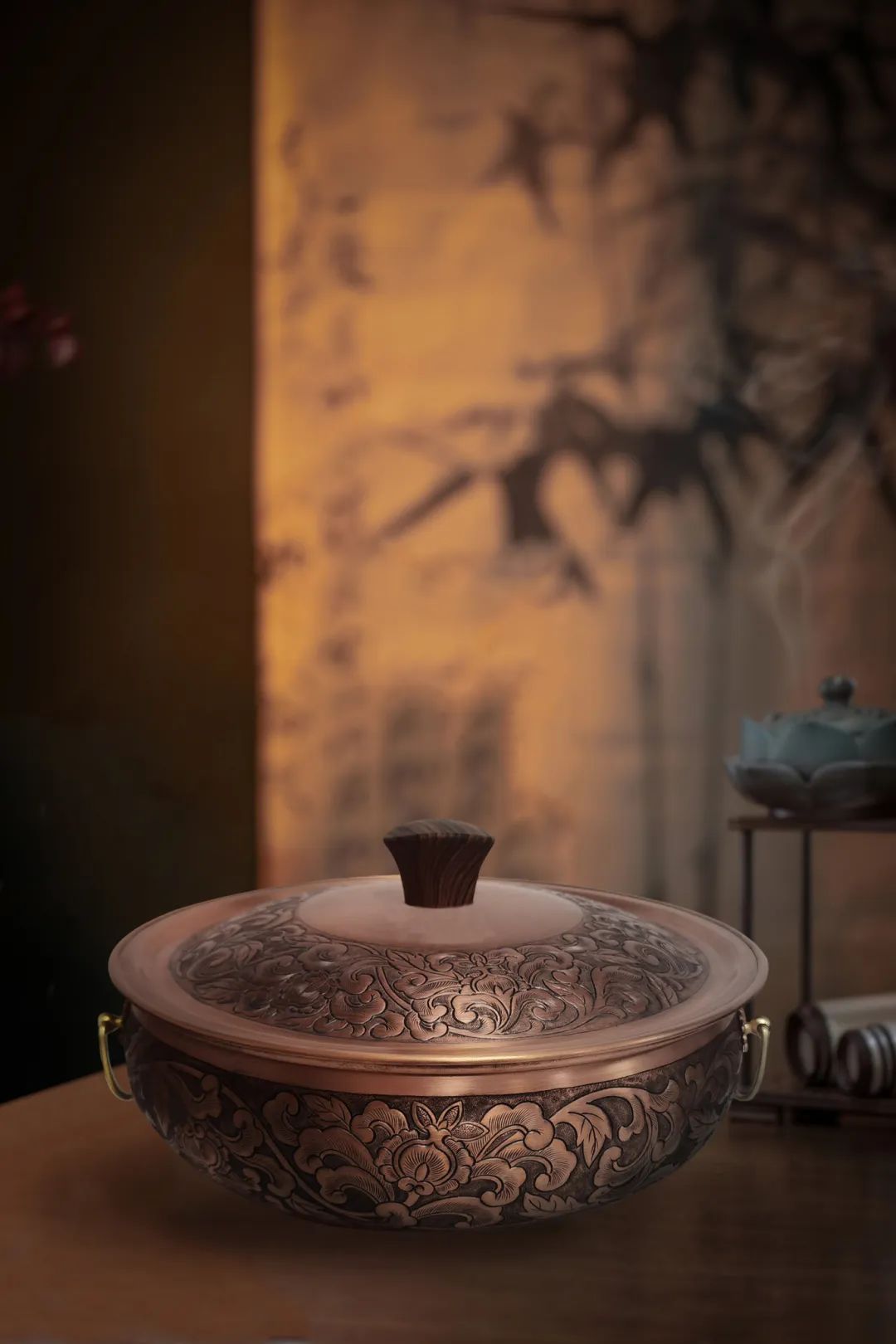 唐韻火鍋,以紫銅鼓式火鍋盆為胎體,以源于宮廷的非遺技藝,手工滿鏨唐草紋而成。唐草紋造型卷曲圓潤,富麗華美,枝莖繁復纏繞,延綿不絕,因盛于唐而得名“唐草紋”,寓意生機勃勃,富貴長春。