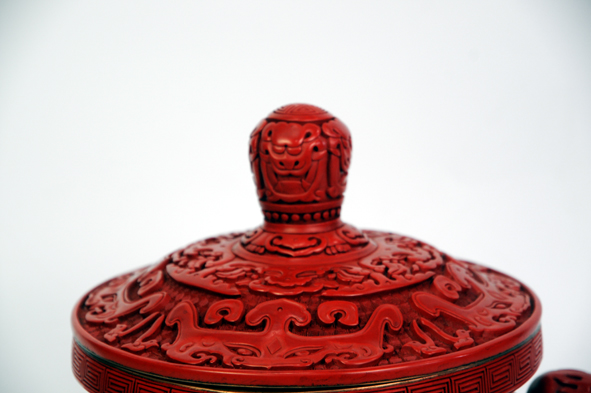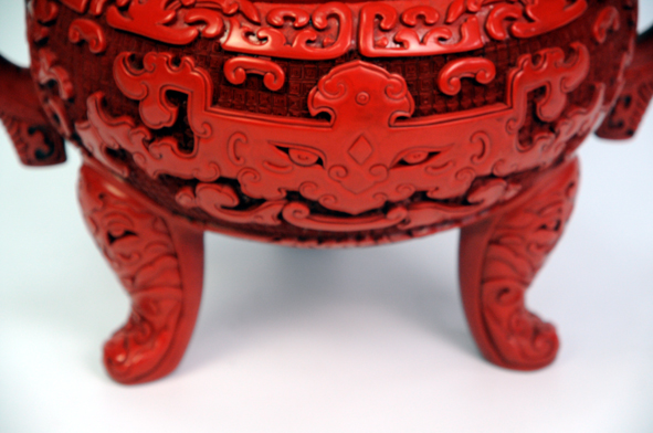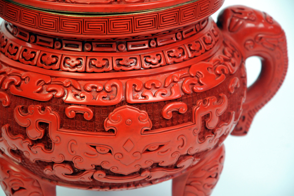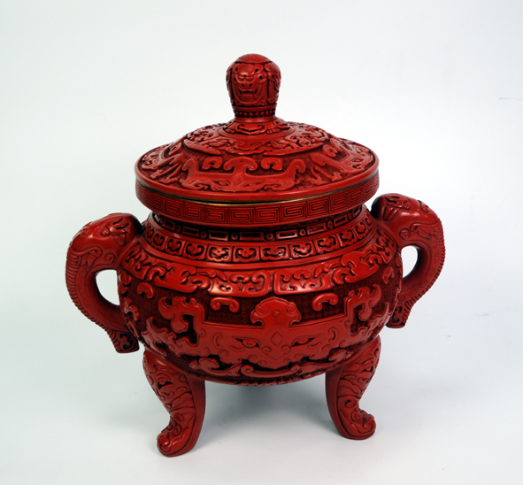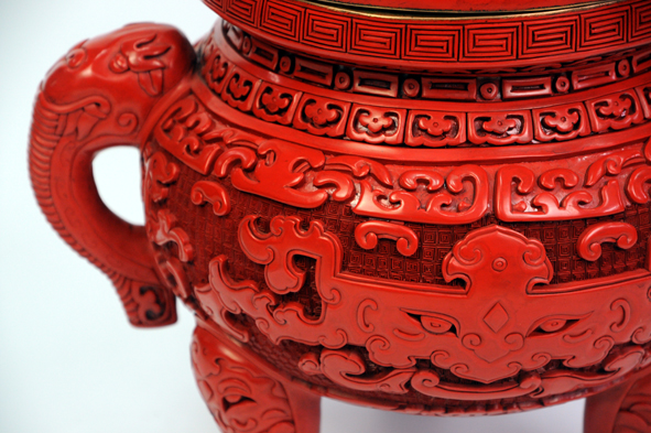 銅胎三足香爐為雕漆大師楊之新所作。爐身及爐蓋刻有傳統(tǒng)圖案饕餮紋,象鼻雙耳,器形穩(wěn)重,雕刻精細(xì)。