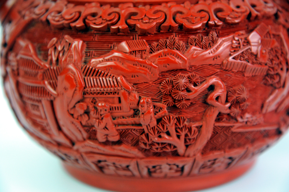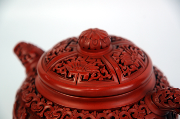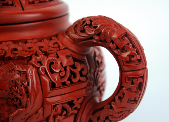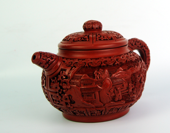 外表為漆,內(nèi)部為砂,兩種材質(zhì)、兩種工藝相結(jié)合,既可沖茶泡茶又可把玩欣賞。表面紋飾為風(fēng)景圖案,設(shè)計精美,刀法精湛。