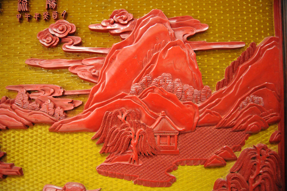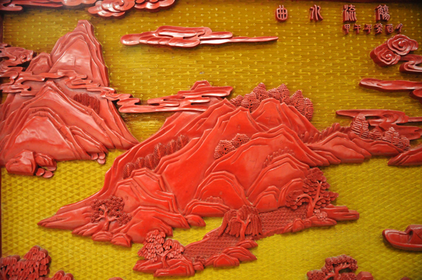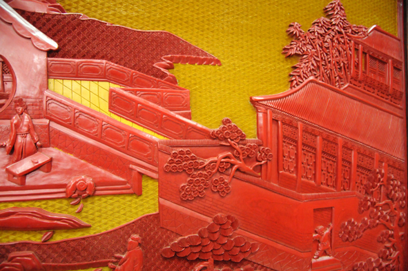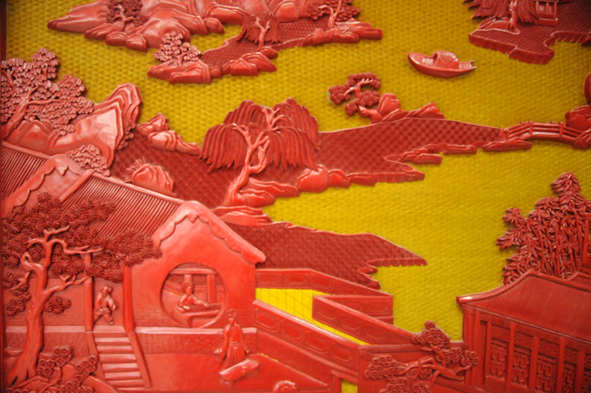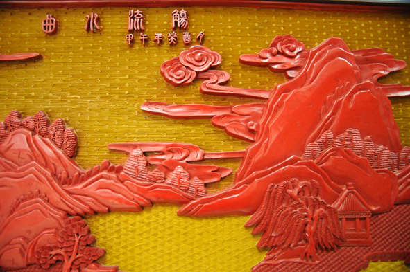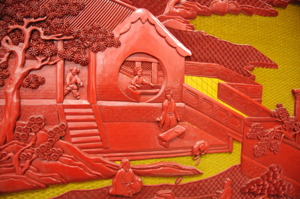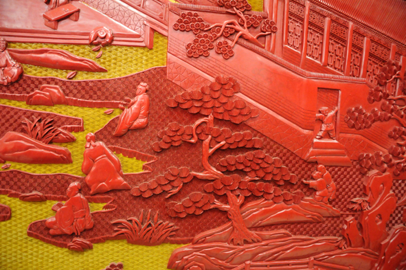 屏風器形較大,采用黃底剔紅工藝。曲水流觴,是中國古代民間的一種傳統(tǒng)習俗,一是歡慶和娛樂,二是祈福免災。后來發(fā)展成為文人墨客詩酒唱酬的一種雅事。