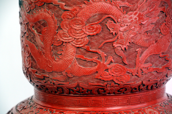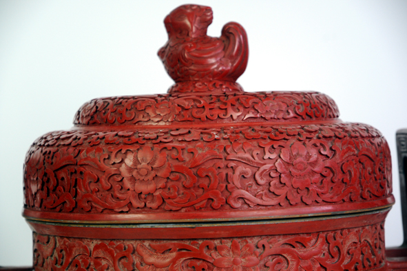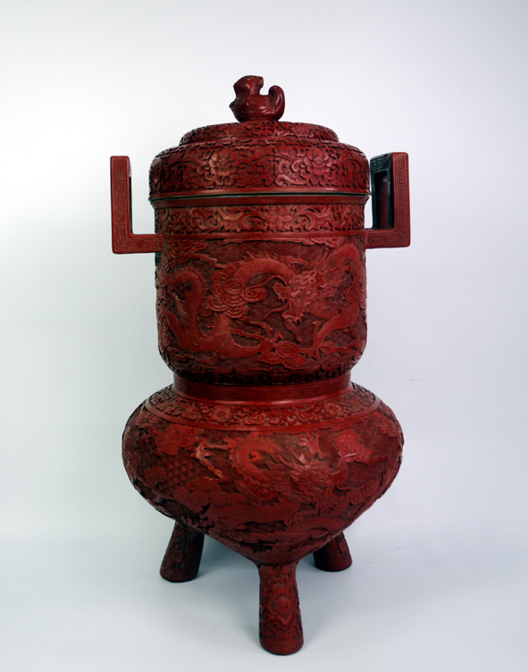 此器為仿西周中期青銅器孚公甗的造型并有所改動,甗原為蒸食用具,后來演變成古代貴族財富、地位、權利的象征。(北京雕漆工廠上世紀八十年代作品)