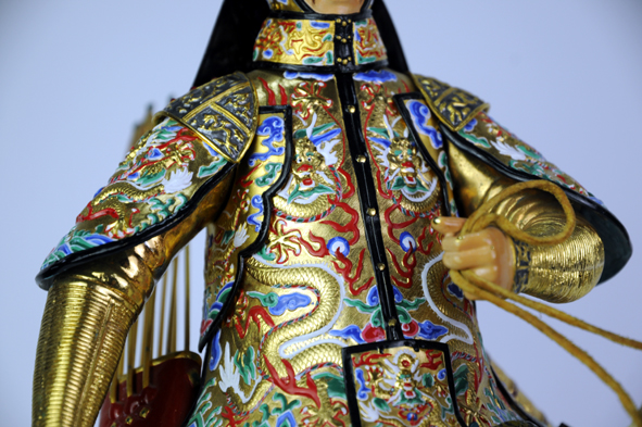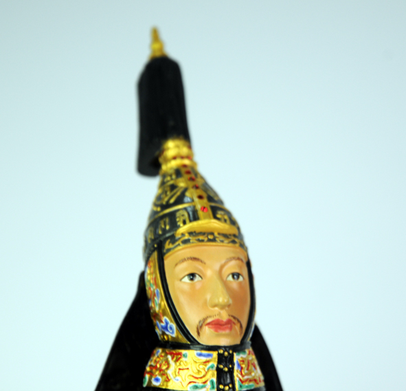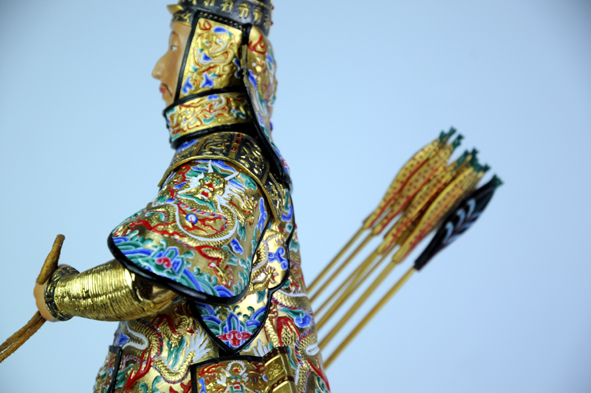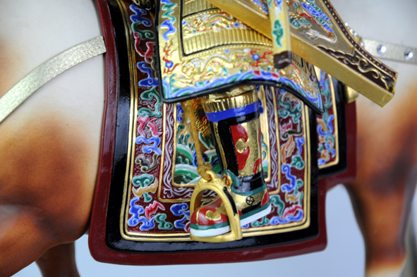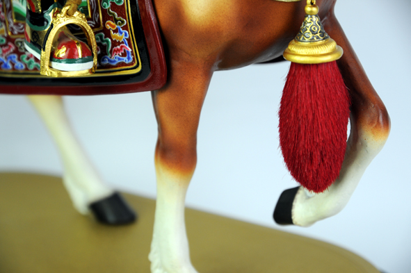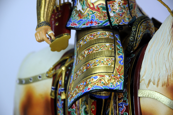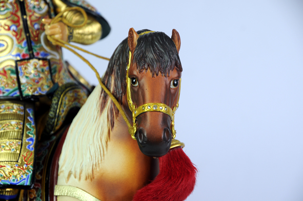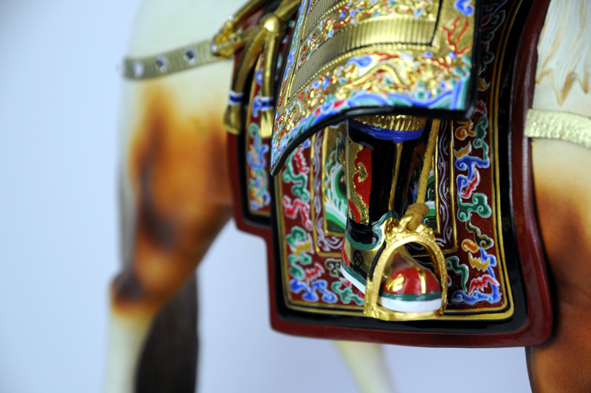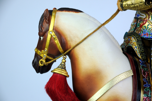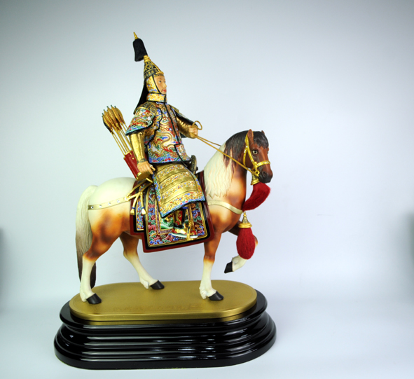 本作品原型來自于郎世寧的盛年佳作《乾隆大閱圖》,圖中乾隆皇帝弘歷29歲時的戎裝加身,精神煥發。圖中的表現技法基本上是采用中國傳統的繪畫工具和材料而取得了西方細筆油畫的藝術效果。整件作品采用鑄銅彩繪工藝,完美復刻了原圖中乾隆皇帝的颯爽英姿的風貌,是一件精美的藝術精品。