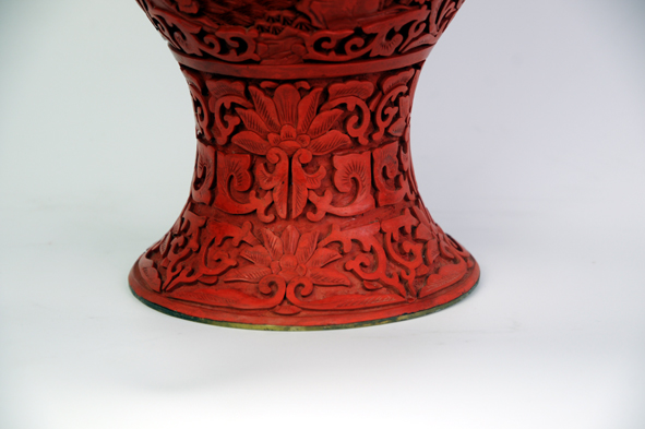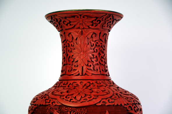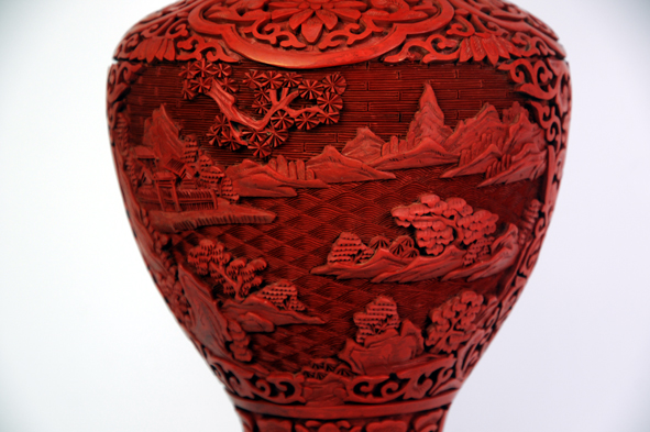 瓶身開窗為山水花鳥風(fēng)景,瓶口及底足為傳統(tǒng)紋飾,雕工精細(xì),美觀大方。