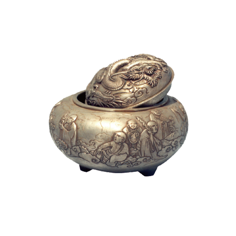 熏爐為點(diǎn)燃香料熏香所用。采用純銀997克,結(jié)合了手工鍛鏨中的平雕、浮雕和圓雕技法制作而成。爐身花紋為佛教故事十六羅漢圖案,爐蓋紋飾為一條騰空的大龍,喻意消除煩惱,不再生死輪回受人間之苦。