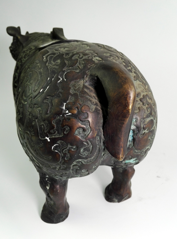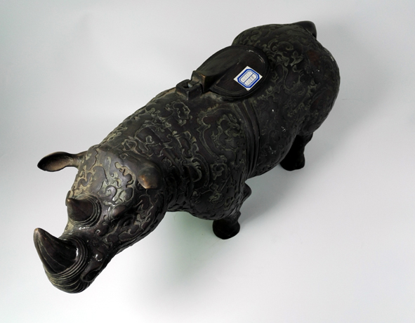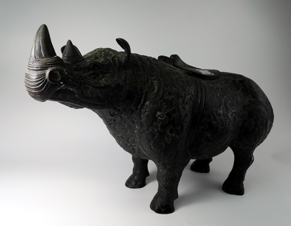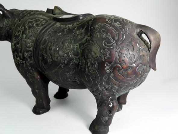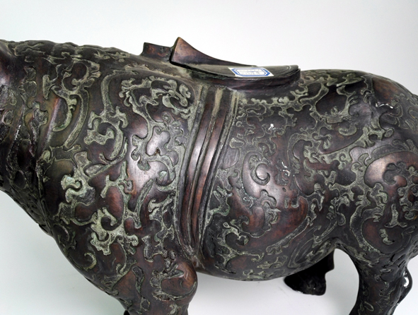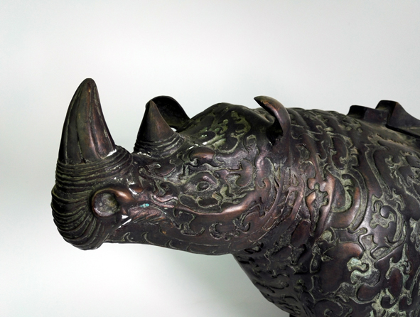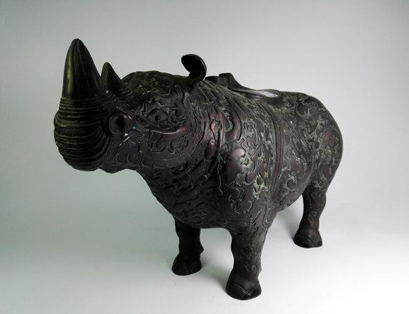 這件銅尊造型是一頭肥碩健壯的犀牛,它目視前方,昂首佇立,頭部有一前一后的雙角,兩耳短小聳立,雙目為料珠鑲嵌,雖小卻閃爍有光,充滿了奕奕的神采,顴骨突起,仿佛可以透過皮膚感覺到骨骼的形狀和起伏,口部一側(cè)設(shè)有管狀流口, 用于倒酒。器腹圓鼓中空,顯得腹部皮肉十分松弛,但結(jié)實(shí)有力,富有韌性,背部有橢圓形尊口,上覆素面銅蓋,蓋有活環(huán), 可以開合,用于注入酒液。犀牛短腿粗壯有力,為三瓣蹄,有力地支撐著沉重的軀體,尾尖稍翹。其骨骼、頭部輪廓、肌肉、蹄足比例準(zhǔn)確,體態(tài)雄健,肌肉發(fā)達(dá),酷似真犀。
